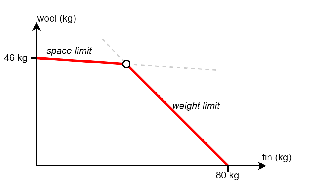 In the graph we can see two axes, the vertical wool axis shows how much wool we loaded onto our donkey and the horizontal tin axis shows how much tin. There are two constraints, we must stay below the weight limit (80 kg) and the space limit (200 L) which are shown in the red lines. Adding too much wool takes us over the space limit, while adding too much tin takes us over the weight limit. Of course, wool also weighs something (0.23 kg/L) and tin also takes up space (6 kg/L) so these lines aren’t perfectly horizontal or vertical. The red line is the Pareto Curve, it’s all the points where we cannot add anything more without also taking something else away.